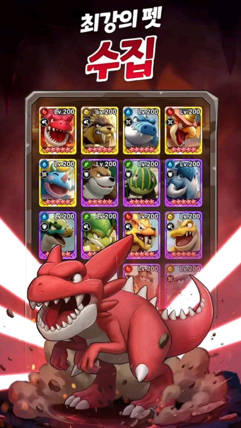 조련사 혼자서 몽둥이를 휘두르는 것만으로는 강력한 적들을 쓰러뜨릴 수 없습니다. 이 게임의 진정한 꽃은 바로 수백 종에 달하는 귀여운 공룡 펫들을 수집하고 육성하는 데 있습니다. 펫들은 각자의 태생 희귀도와 고유한 속성을 지니고 있으며, 등급이 올라갈수록 화면을 꽉 채우는 화려한 스킬 연출과 압도적인 파괴력을 자랑합니다.