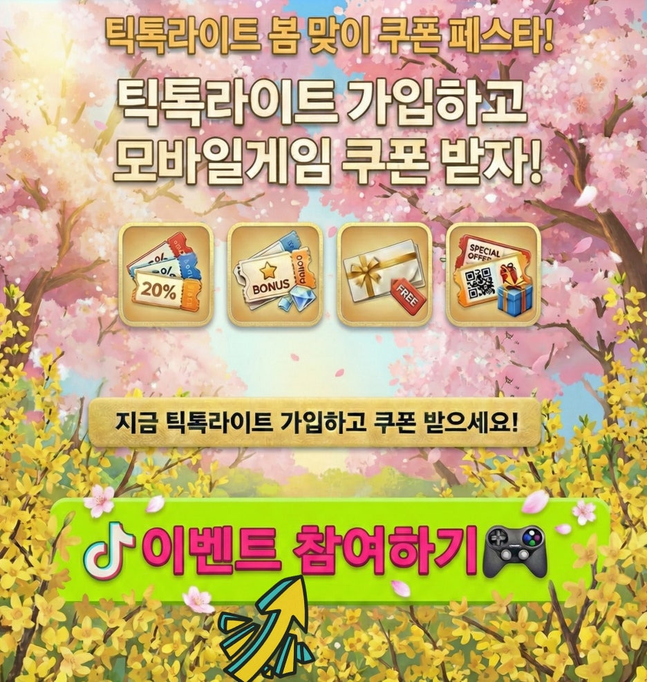 4.메인 화면 아래쪽의 [틱톡라이트와 봄을 기다리며 3월 모바일게임 쿠폰 페스타 진행해봄~!] 배너를 탭합니다.